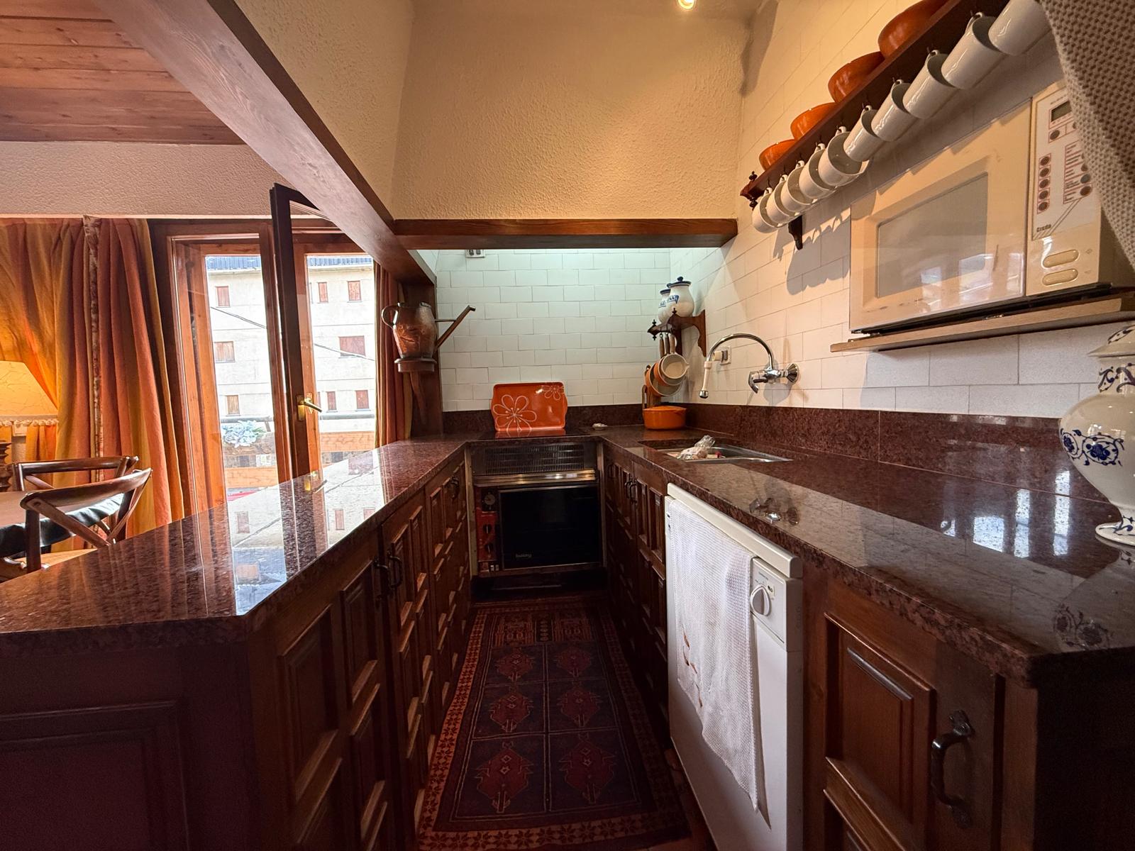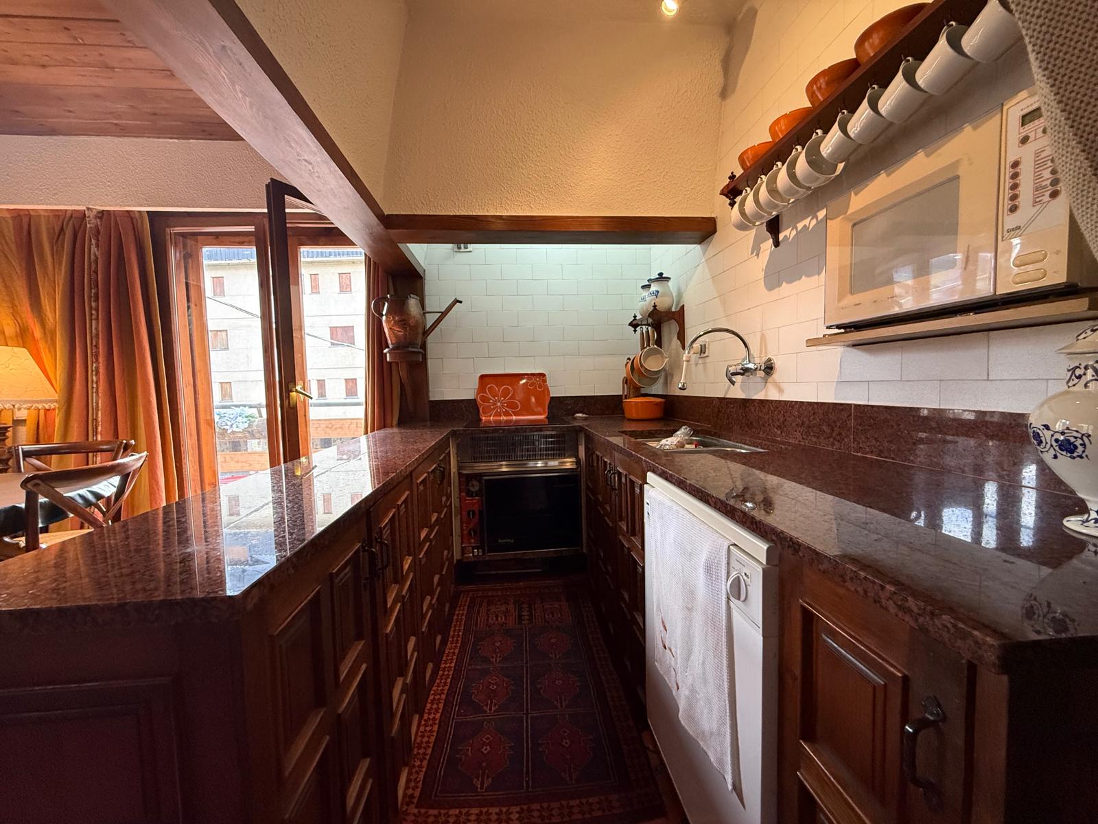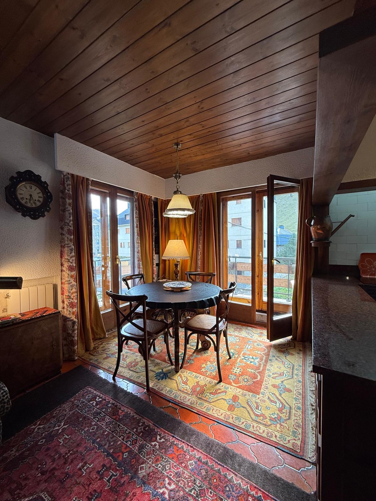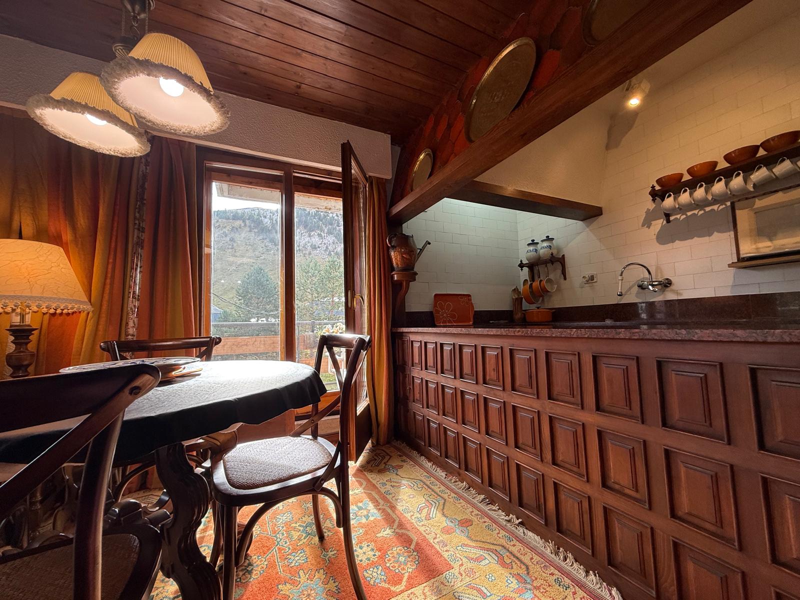 El amplio salón, con una cocina abierta de estilo alpino y totalmente equipada, es el espacio perfecto para compartir momentos inolvidables con familia y amigos. Desde aquí, accede a una maravillosa terraza orientada al sur, donde podrás deleitarte con impresionantes vistas de las pistas de esquí y las majestuosas montañas que rodean la zona. La luminosidad inunda cada rincón del apartamento durante todo el día, creando un ambiente cálido y acogedor.