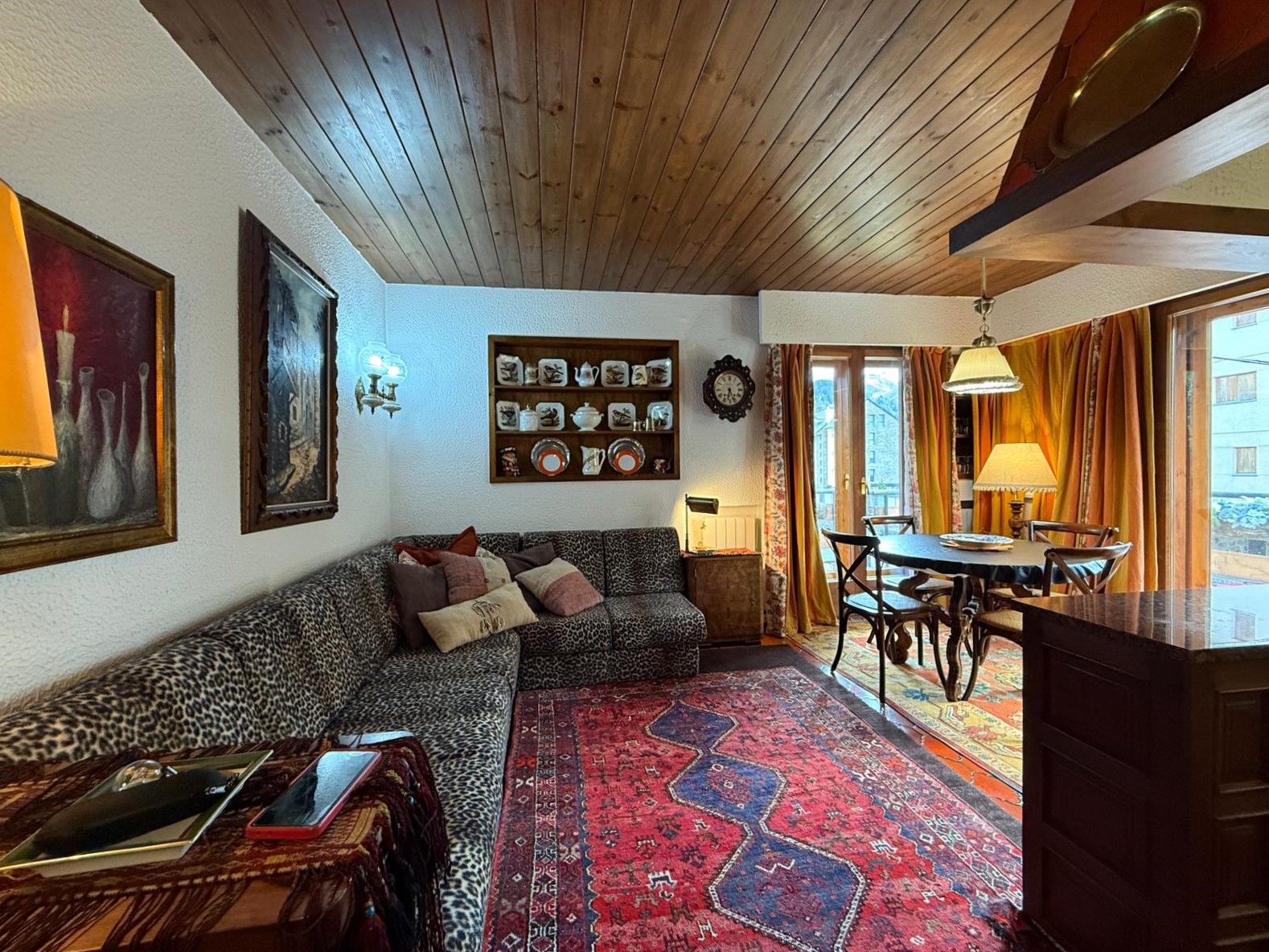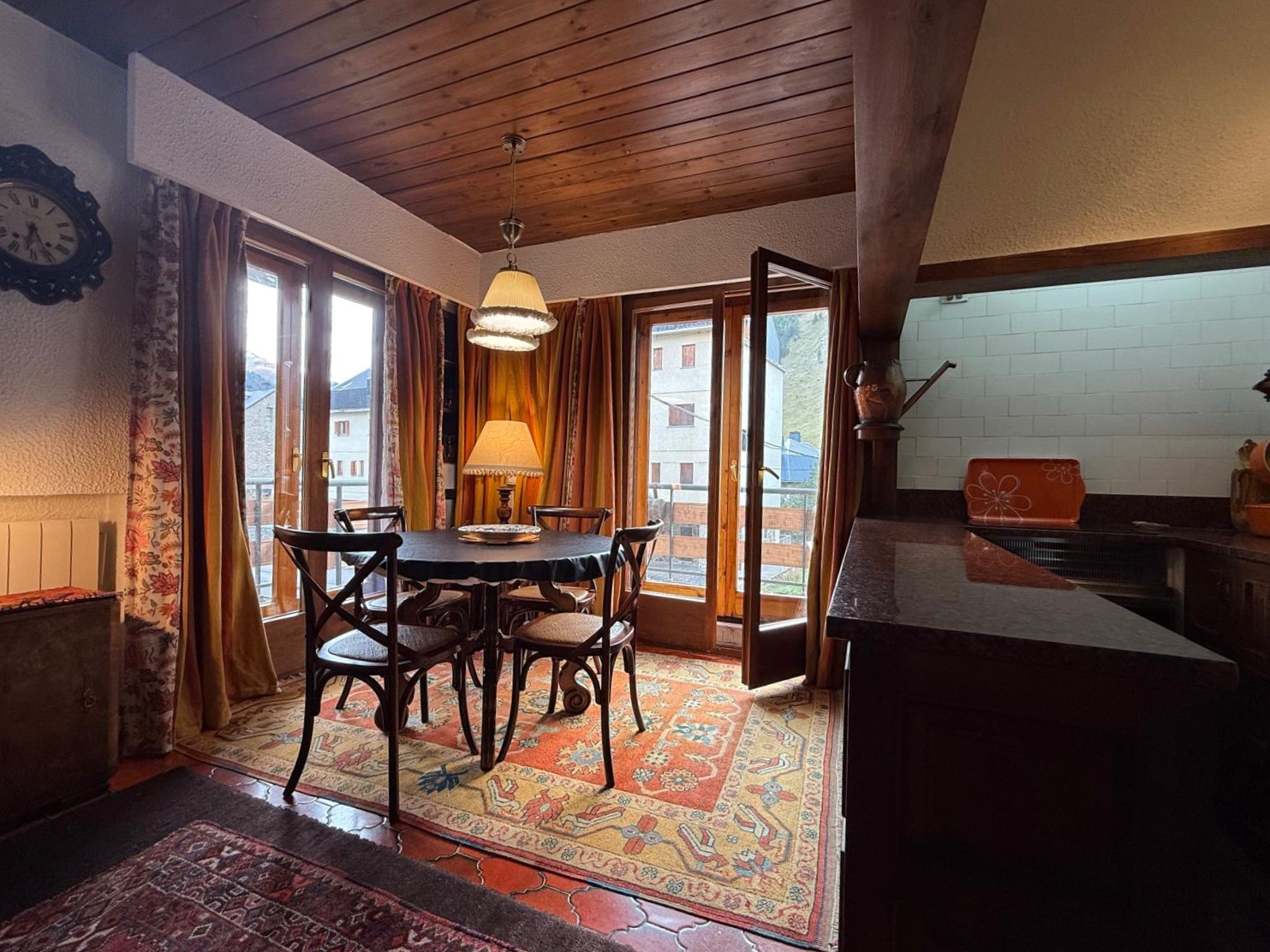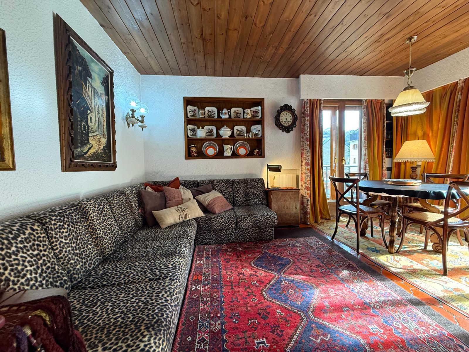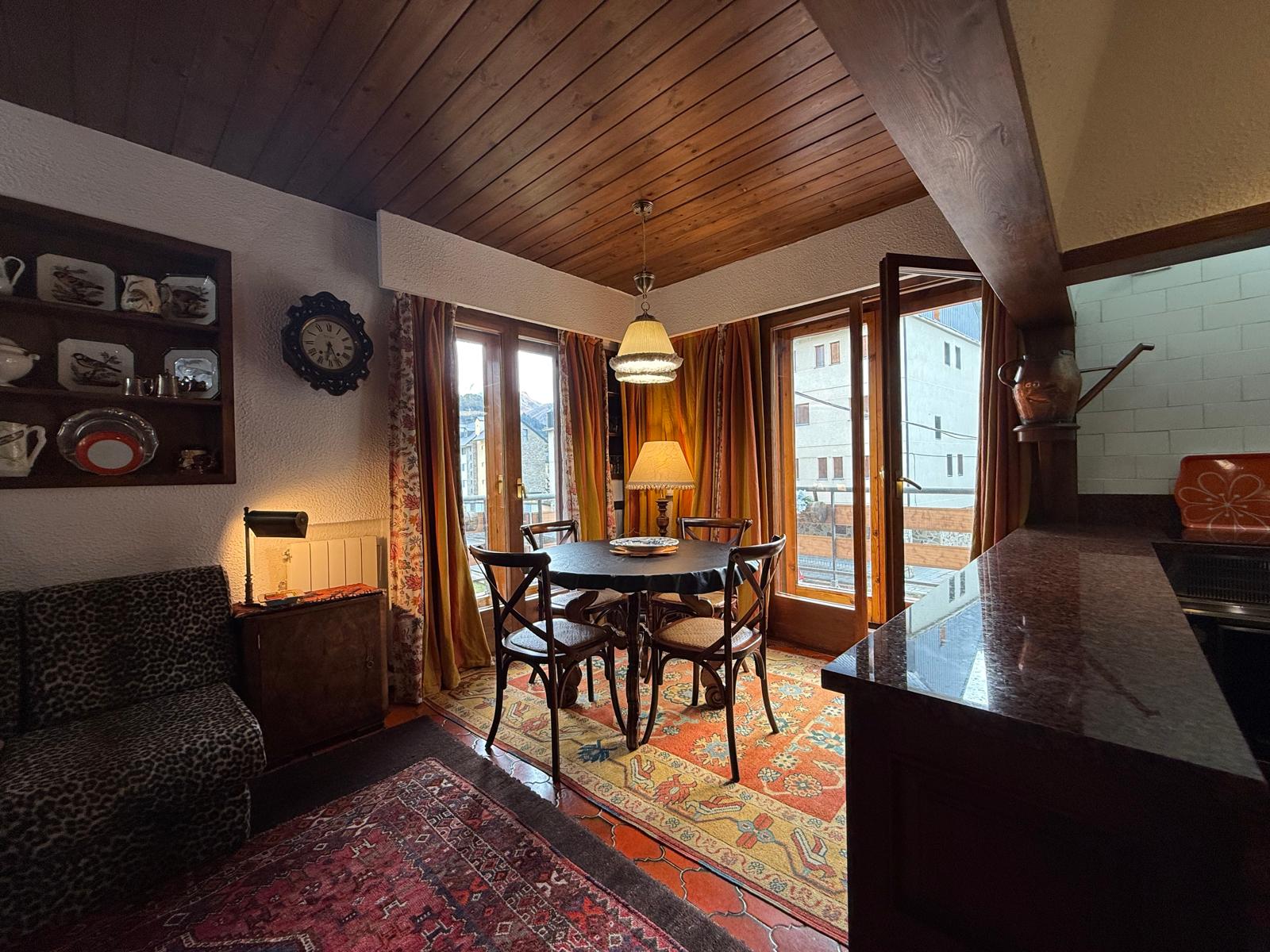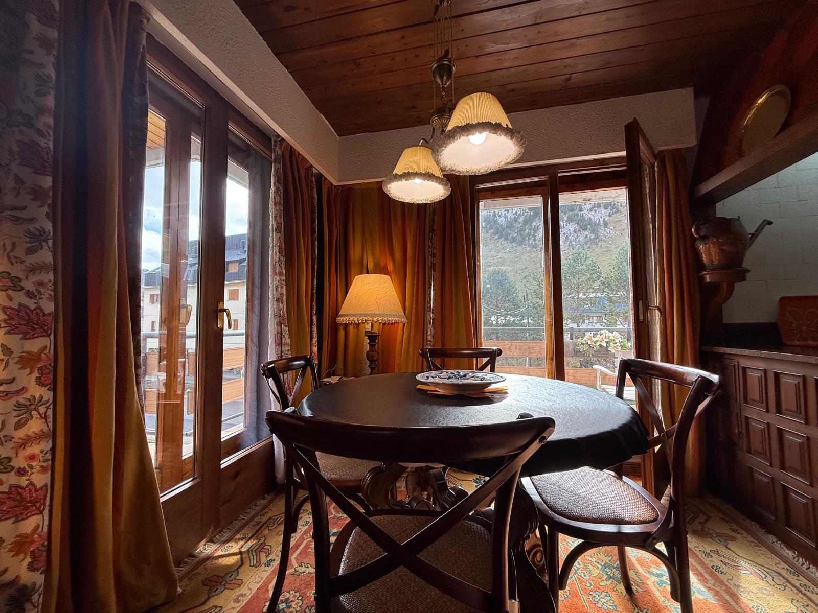 El amplio salón, con una cocina abierta de estilo alpino y totalmente equipada, es el espacio perfecto para compartir momentos inolvidables con familia y amigos. Desde aquí, accede a una maravillosa terraza orientada al sur, donde podrás deleitarte con impresionantes vistas de las pistas de esquí y las majestuosas montañas que rodean la zona. La luminosidad inunda cada rincón del apartamento durante todo el día, creando un ambiente cálido y acogedor.